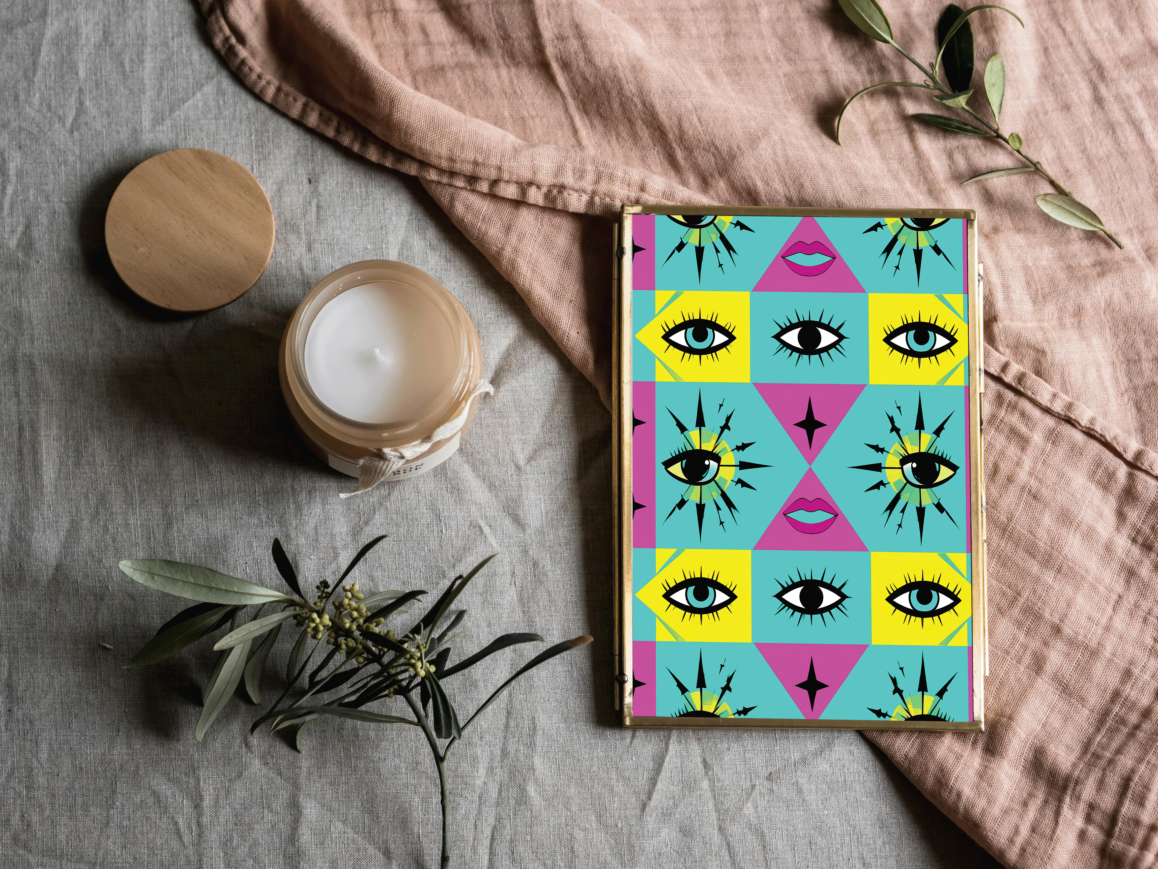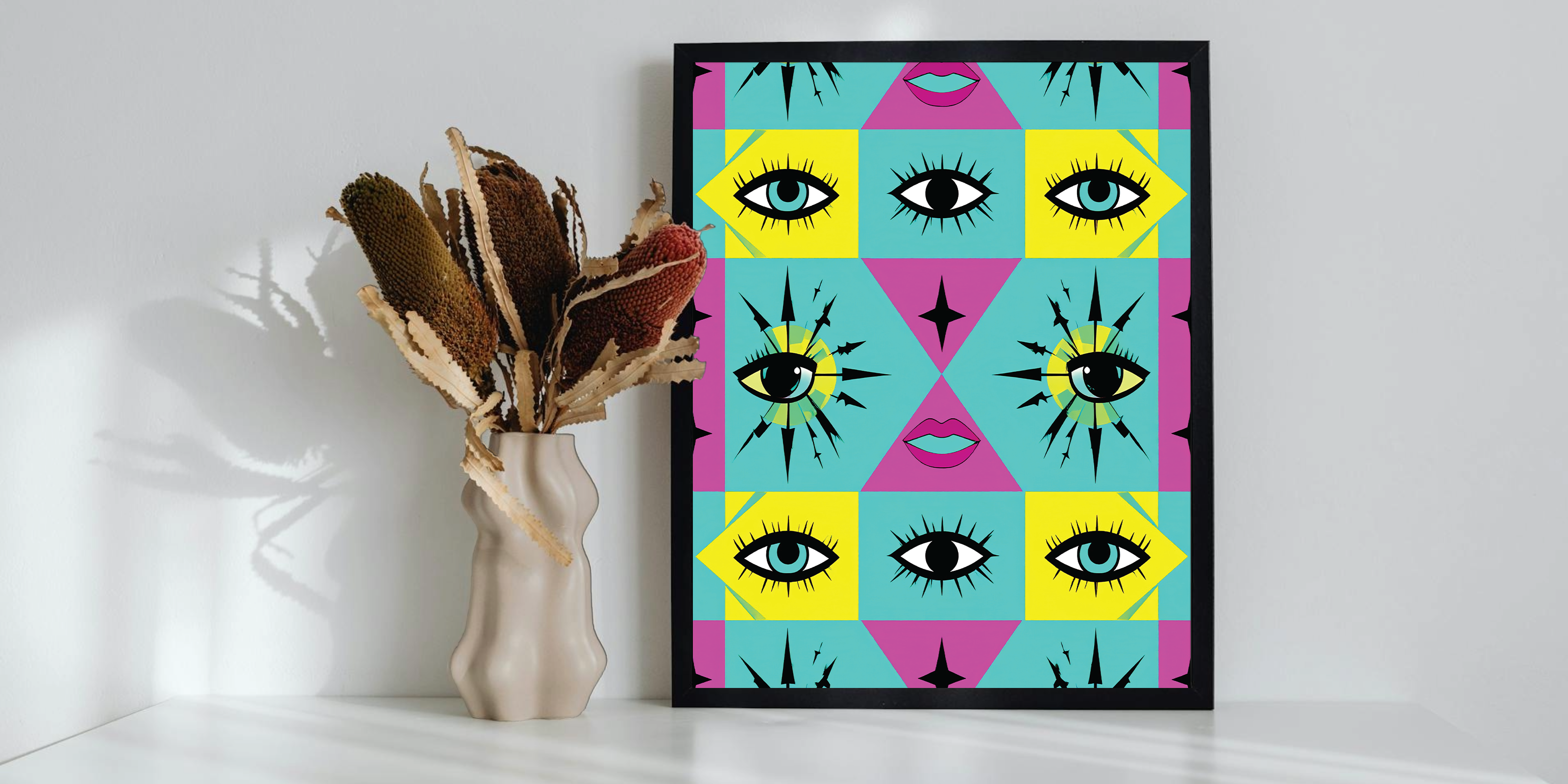 A lively procession of stylized eyes marches across a vibrant field of magenta, teal, and yellow. With bold outlines and playful repetition, the piece channels classic pop art energy while turning the gaze back on the viewer.